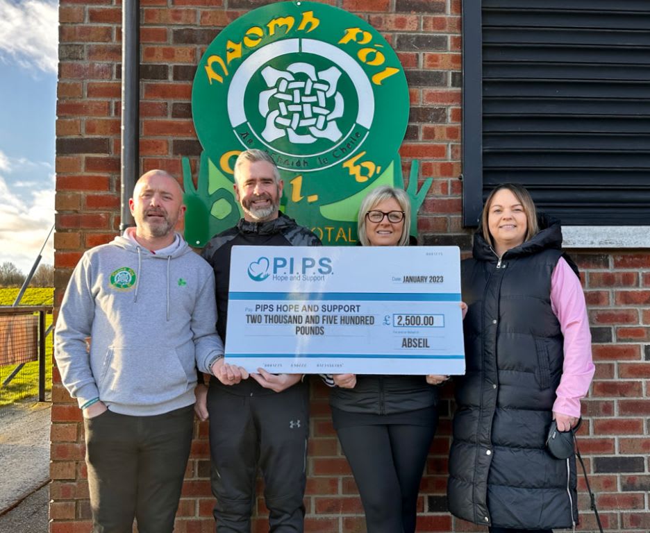 Pictured on Saturday 14th January 2023, at St. Paul’s GFC Lurgan are Stephen Shanks, Mark McKeown, Lisa Gilmore and Emma Gilmore presenting a magnificent £2,500.00 raised from their recent abseil at Belfast Castle.